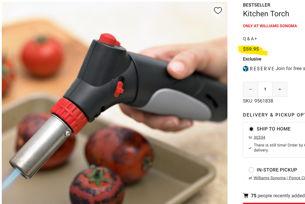 Over 99% sold - EARLY BIRD SECRET DEAL - Premium Culinary Torch with Gas Gauge - High end culinary torches are $60 at Williams Sonoma (see additional image), but just $9.99 from us! - STEP UP YOUR COOKING GAME! You will use this for so much! "Like what?" you ask?? Brûlée the Sugar on a Crème Brûlée and Other Deserts, Toast Marshmallows for S’Mores, Get Perfect Toasting for a Grill Cheese/Patty Melt etc, Brown the Top of Mac n Cheese, Get Beautifully Browned Crust on Au Gratin Potatoes, Get the PERFECT Finish to French Onion Soup and much more! - Order 4 or more and SHIPPING IS FREE - WANT TO ORDER WITH ONE SIMPLE TXT? Reply to today's txt with the word COOK and the quantity you want and we will bill your card on file & ship to your address on file! Example: cook 3 will order three units - How cool is that?