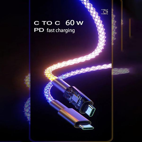 60W Fast Charging & Data Sync This RGB Light gradual usb c to type c fast charging cord supports PD 3.0 and QC 3.0 fast charger(such as: 18W/ 30W/ 45W/ 60W). Support up to 60W (3A) safe high-speed charging, And the data transfer speed is up to 40-60MB/s (480Mbps) , allowing you to easily sync videos/music and files, etc.
